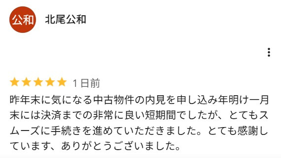 昨年末に気になる中古物件の内見を申し込み、年明け1月末には決済までの非常に短期間でしたがとてもスムーズに手続きを進めていただきました。