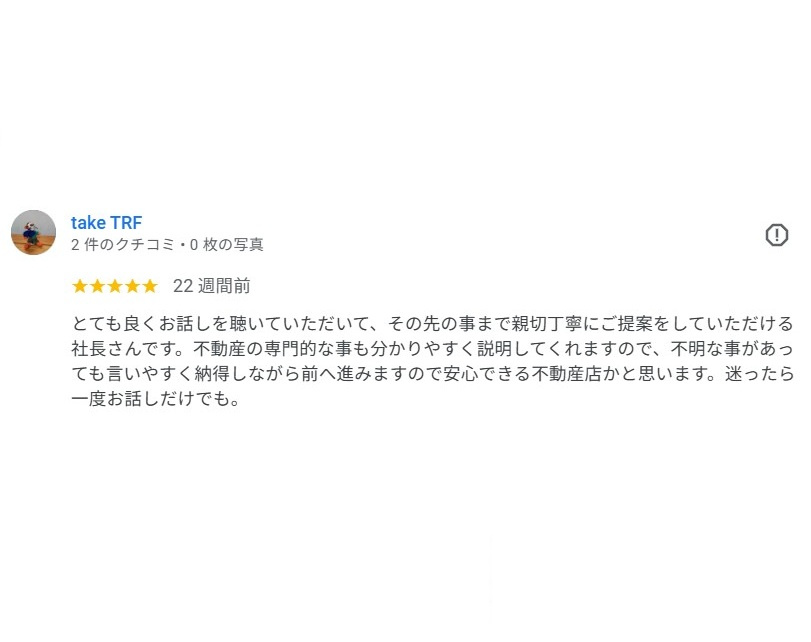 とても良くお話しを聴いていただいて、その先の事まで親切丁寧にご提案をしていただける社長さんです。不動産の専門的な事も分かりやすく説明してくれますので、不明な事があっても言いやすく納得しながら前へ進みますので安心できる不動産店かと思います。迷ったら一度お話しだけでも。